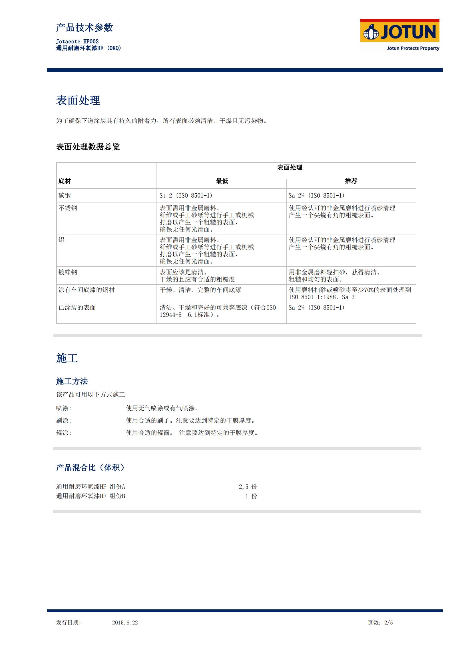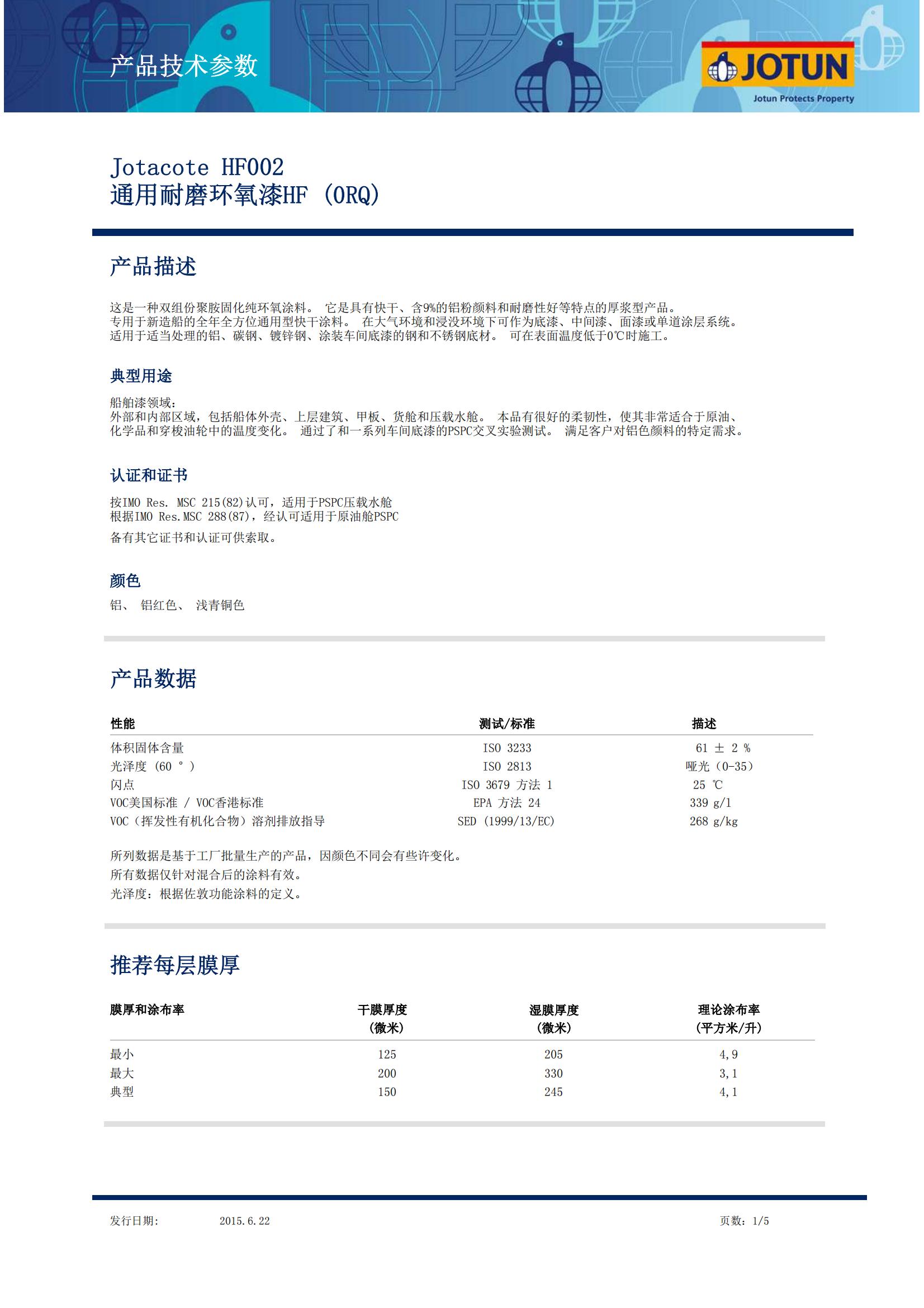 • Jotacote HF002 0RQ:這是一種雙組份聚胺固化純環(huán)氧涂料。 它是具有快干、含9%的鋁粉顏料和耐磨性好等特點的厚漿型產(chǎn)品。專用于新造船的全年全方位通用型快干涂料。 在大氣環(huán)境和浸沒環(huán)境下可作為底漆、中間漆、面漆或單道涂層系統(tǒng)。適用于適當處理的鋁、碳鋼、鍍鋅鋼、涂裝車間底漆的鋼和不銹鋼底材。 可在表面溫度低于0°C時施工。典型用途:外部和內(nèi)部區(qū)域,包括船體外殼、上層建筑、甲板、貨艙和壓載水艙。 本品有很好的柔韌性,使其非常適合于原油、化學(xué)品和穿梭油輪中的溫度變化。 通過了和一系列車間底漆的PSPC交叉實驗測試。 滿足客戶對鋁色顏料的特定需求