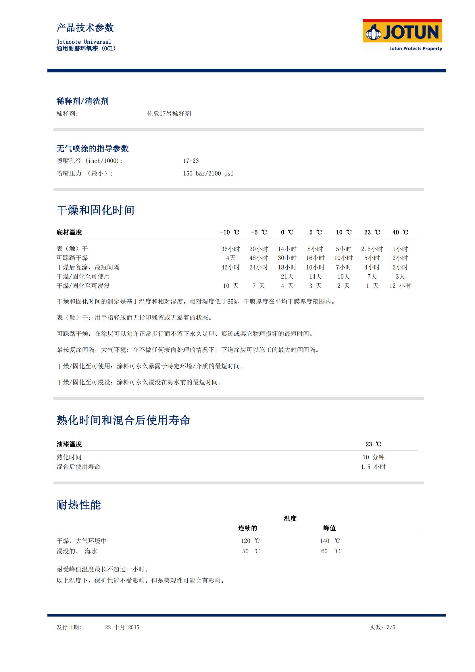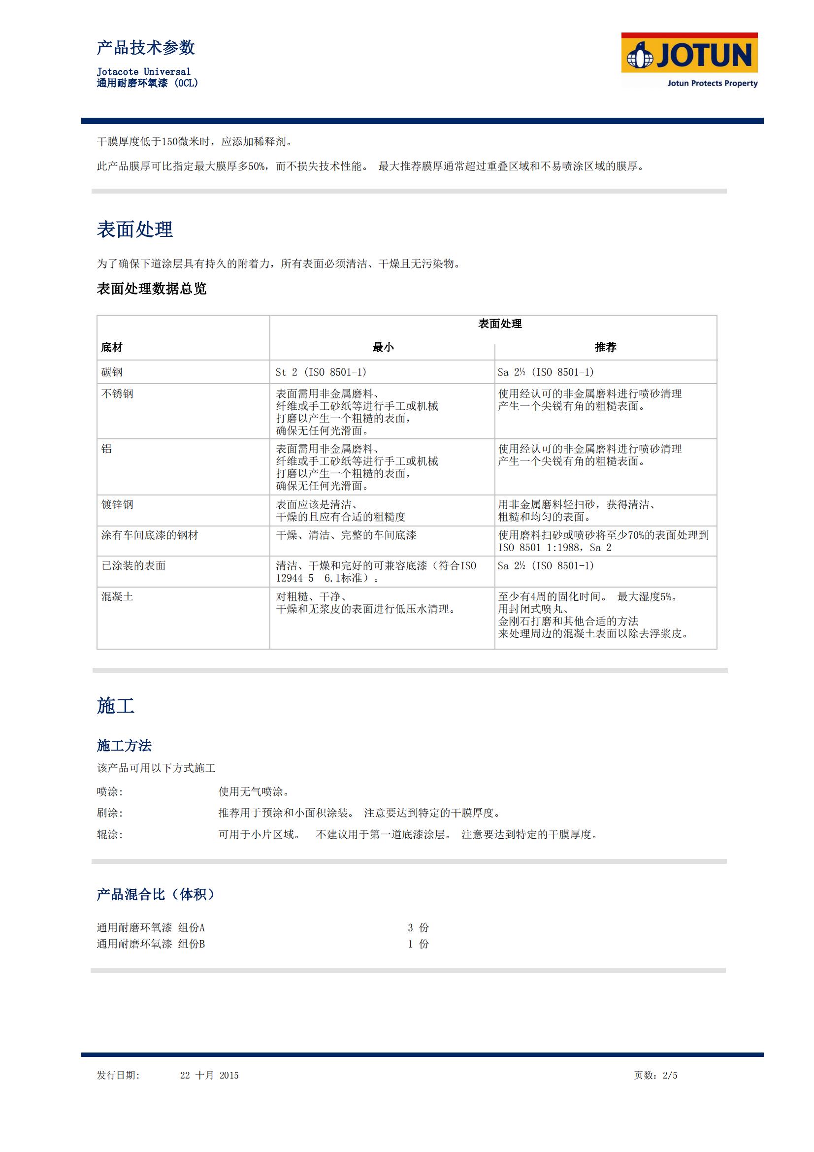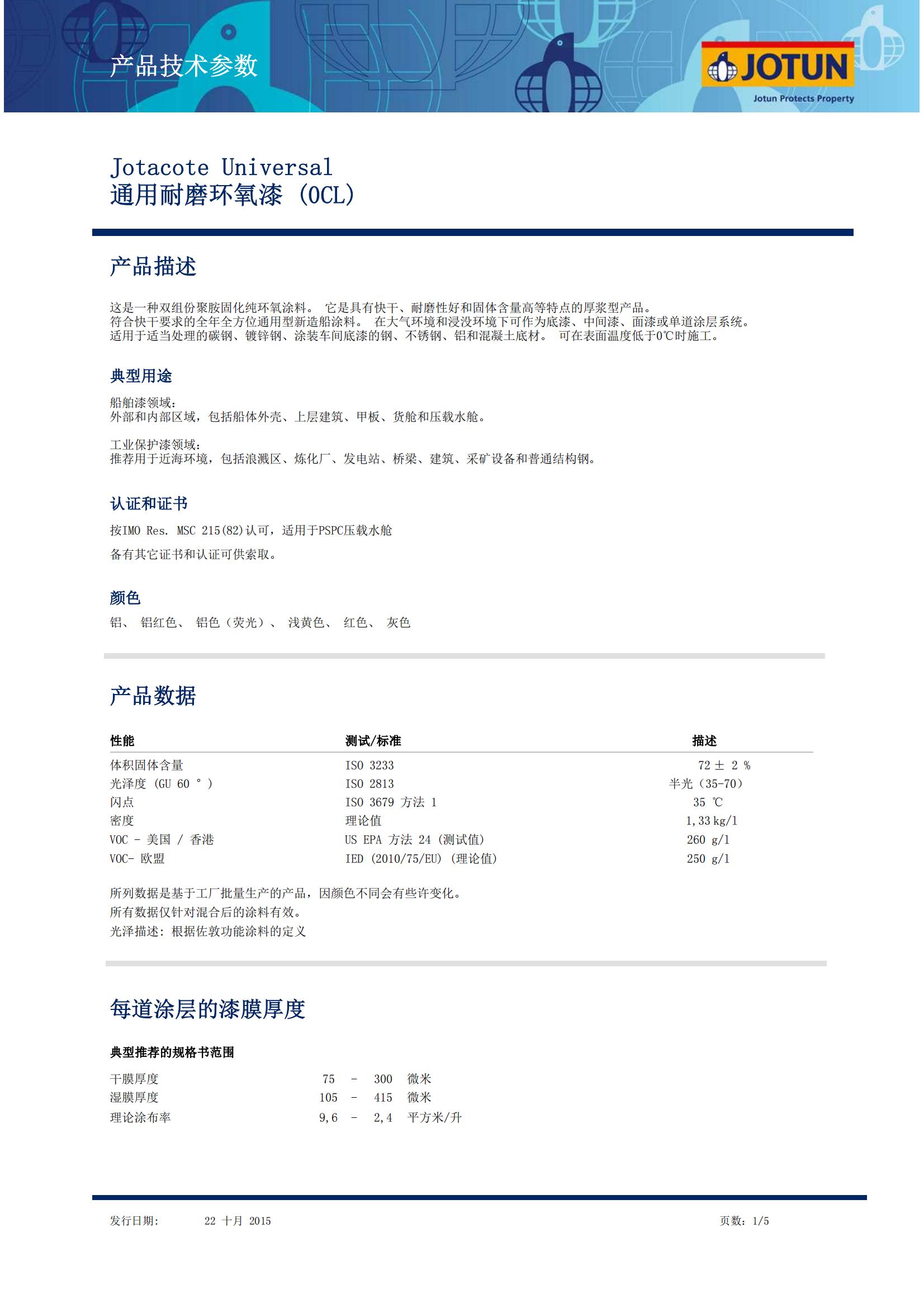 • Jotacote Universal 0CL:這是一種雙組份聚胺固化純環(huán)氧涂料。 它是具有快干、耐磨性好和固體含量高等特點的厚漿型產(chǎn)品。符合快干要求的全年全方位通用型新造船涂料。 在大氣環(huán)境和浸沒環(huán)境下可作為底漆、中間漆、面漆或單道涂層系統(tǒng)。適用于適當處理的碳鋼、鍍鋅鋼、涂裝車間底漆的鋼、不銹鋼、鋁和混凝土底材。 可在表面溫度低于0°C時施工,典型用途船舶漆領(lǐng)域:外部和內(nèi)部區(qū)域,包括船體外殼、上層建筑、甲板、貨艙和壓載水艙。工業(yè)保護漆領(lǐng)域:推薦用于近海環(huán)境,包括浪濺區(qū)、煉化廠、發(fā)電站、橋梁、建筑、采礦設(shè)備和普通結(jié)構(gòu)鋼